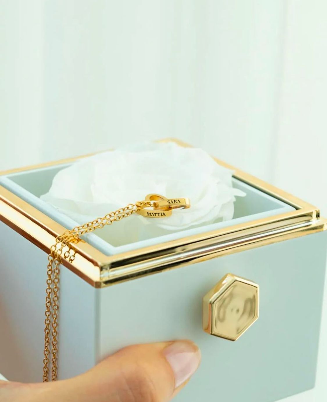 Nuestro paquete especial con una rosa auténtica estabilizada para conservar su belleza de por vida, gira para revelar un collar acabado en oro de 18 quilates personalizado con grabados de su elección. Es un regalo que quedará grabado para siempre en el corazón de su persona especial, imagine su reacción... ❤️